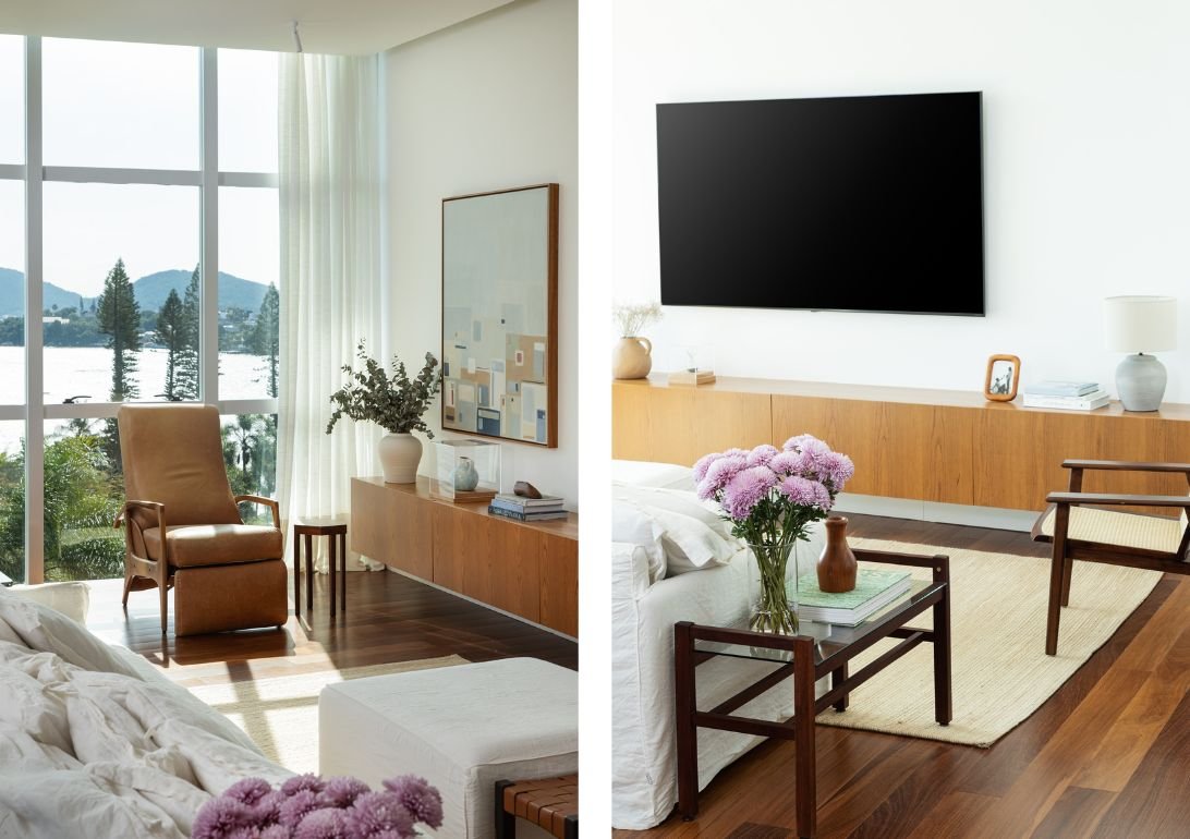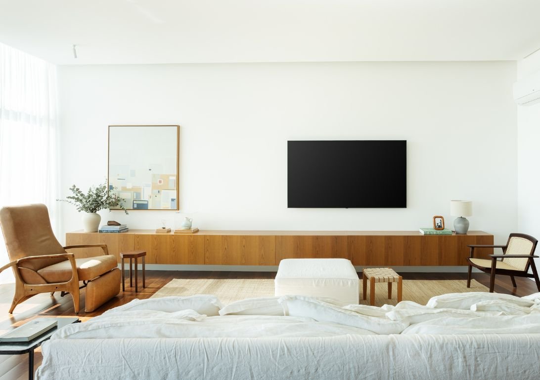 Para criar um visual mais harmonioso, a Lu decidiu colocar um armário sob a TV que se estendesse por toda a largura da sala. Ela optou por um rack de 5,7 metros com seis portas basculantes de 95 cm cada. Esse espaço é perfeito para esconder aqueles itens que não são tão bonitos, como eletrônicos, fios, controles e brinquedos, mantendo tudo organizado e fácil de acessar. Afinal, a sala de estar é um dos cômodos mais movimentados da casa!