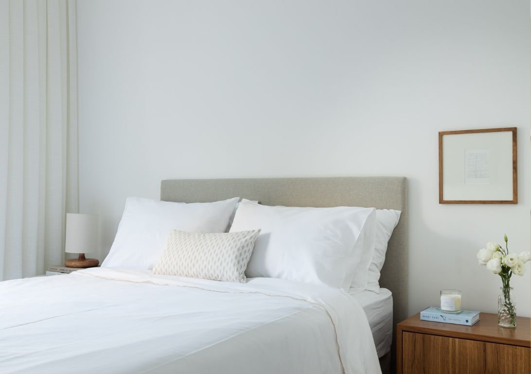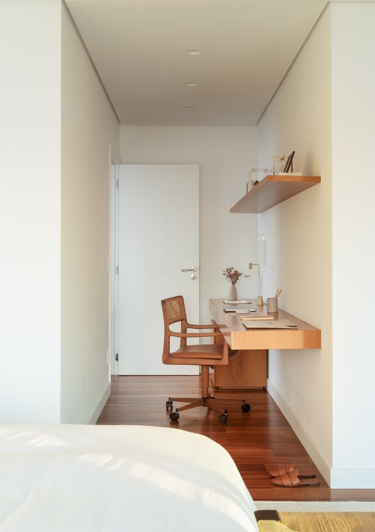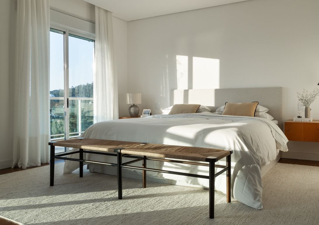 Neste quarto, o foco é no essencial, com um design minimalista e funcional. As mesas de cabeceira suspensas, com 70 cm de largura e 25 cm de profundidade, são um ótimo trazem leveza e oferecem o espaço necessário para itens essenciais. O banco no pé da cama complementa o espaço de forma prática, proporcionando um lugar extra para sentar.