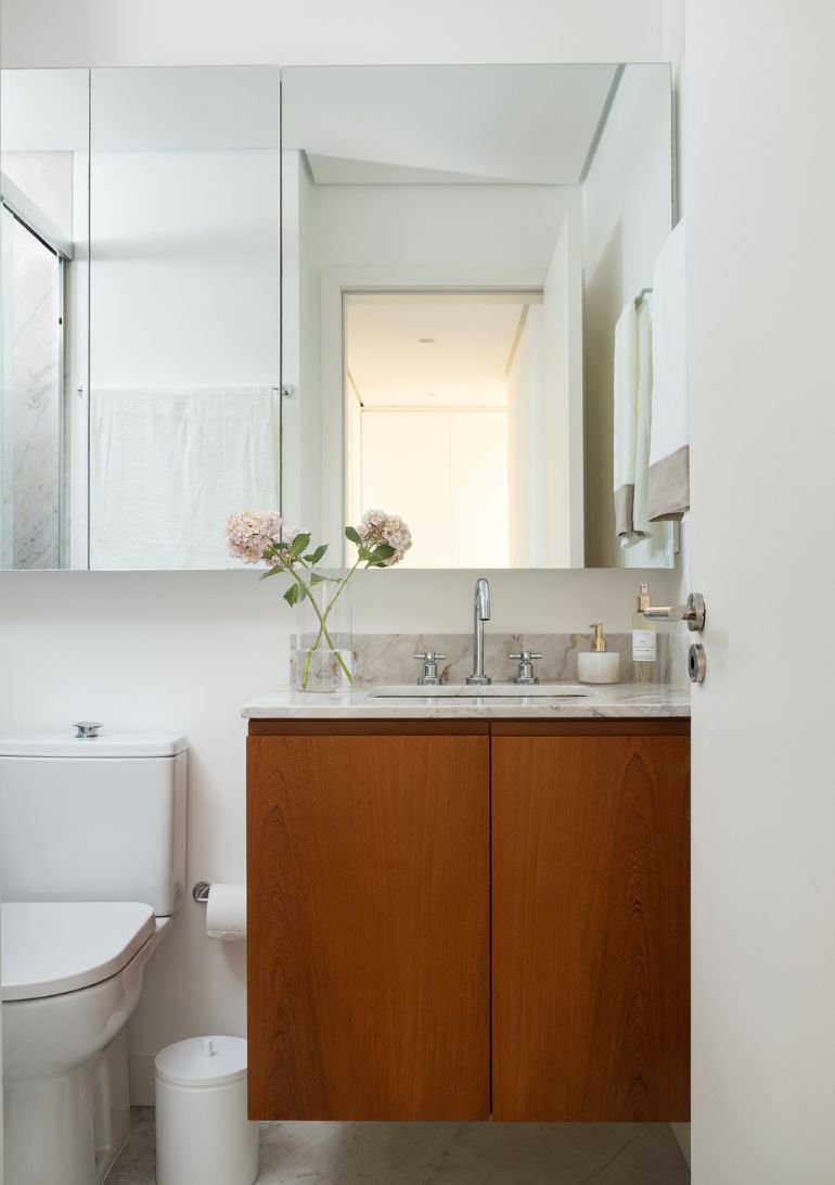 O banheiro de visitas mantém a mesma estética da casa, com um toque especial. Um grande espelho cobre toda a parede, criando uma sensação de amplitude. O espelho foi projetado com três cortes: um fixo e dois com abertura, estrategicamente posicionados para guardar objetos pessoais de forma prática e discreta.