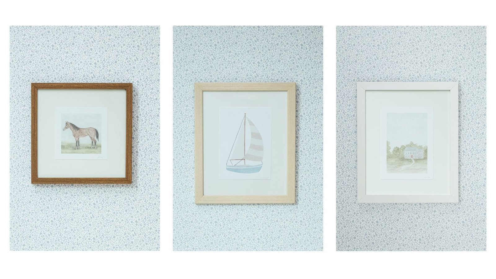 Para completar a decoração nas paredes, desenvolvemos três quadros exclusivos que evocam a serenidade e trazem um ar natural para dentro de casa. Feitos em aquarela e impressos em atelier para manter o máximo do toque artesanal da pintura original, esses quadros possuem passe-partout off-white e moldura em madeira, um verdadeiro charme.