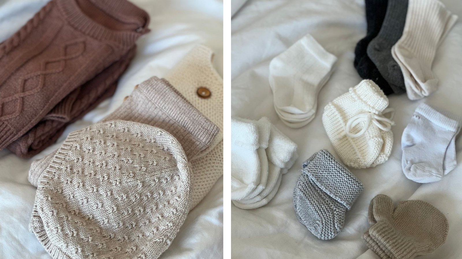 Roupas (bodies, macacões, calças, meias e touca) – dentro do saquinho de maternidade – 06 conjuntos de roupa de baixo + roupa de cima (conforme estação do ano) – Deixe etiquetada qual a primeira roupinha a se colocar e também qual você deseja que o bebê saia da maternidade