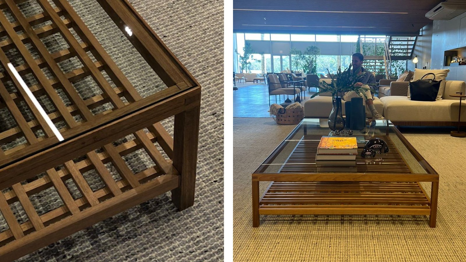 Ela poderia ser uma mesa de centro simples, se não fossem pelas suas tramas na parte inferior. É uma mesa de centro que pode ser a protagonista do espaço. Suas dimensões generosas fazem com que os objetos expostos ali ganhem destaque e completem o ambiente de estar com muitas memórias.