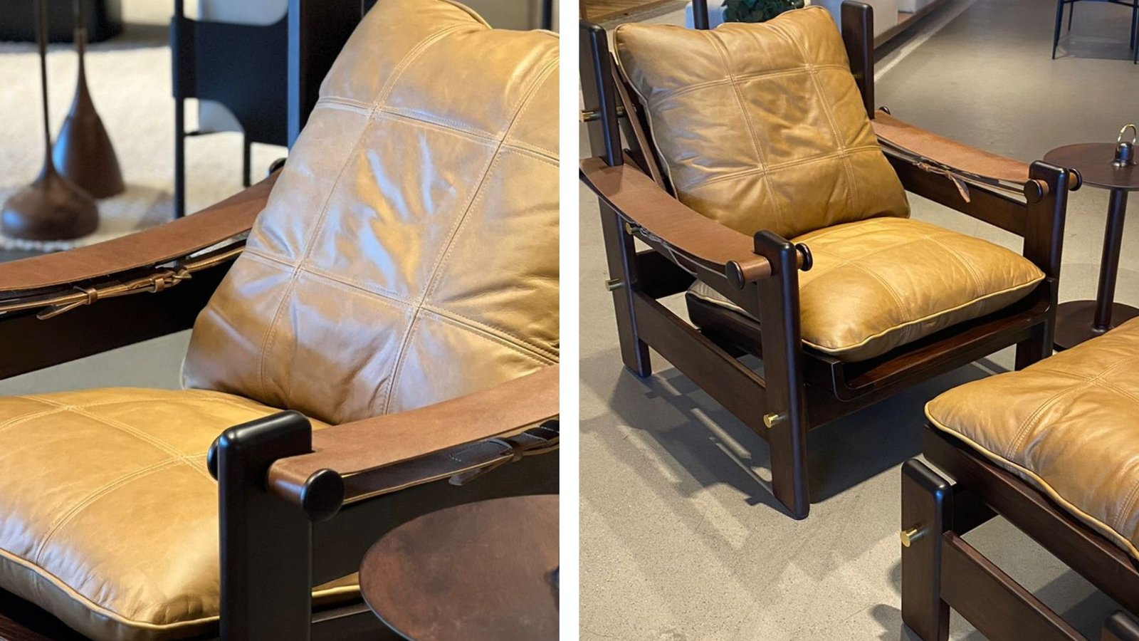 O modelo original é da década de 70, potencializando o que pregamos aqui no escritório: um bom design não tem prazo de validade. O design atemporal e os materiais naturais nos encantam nessa composição: madeira e couro, além de muito conforto.