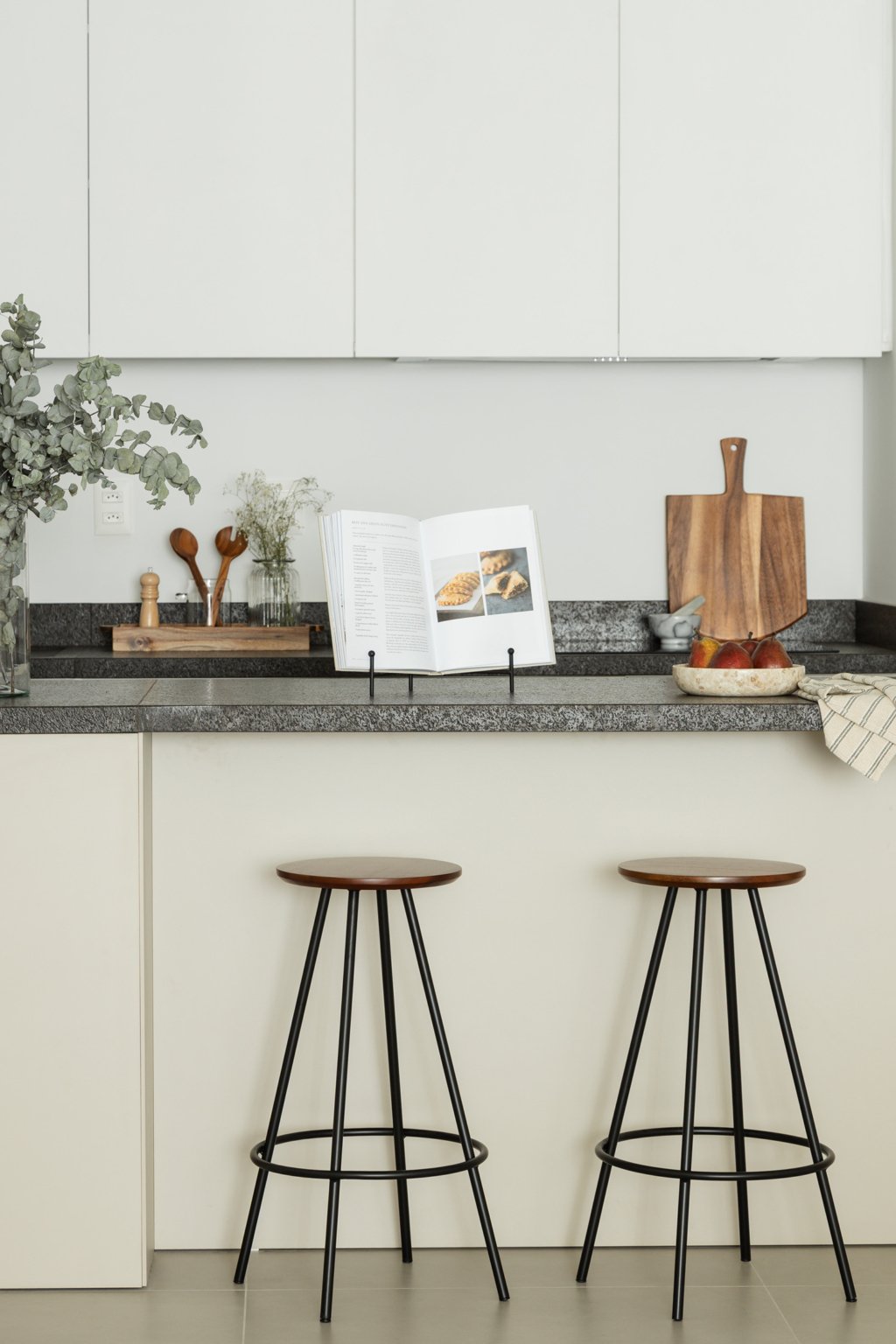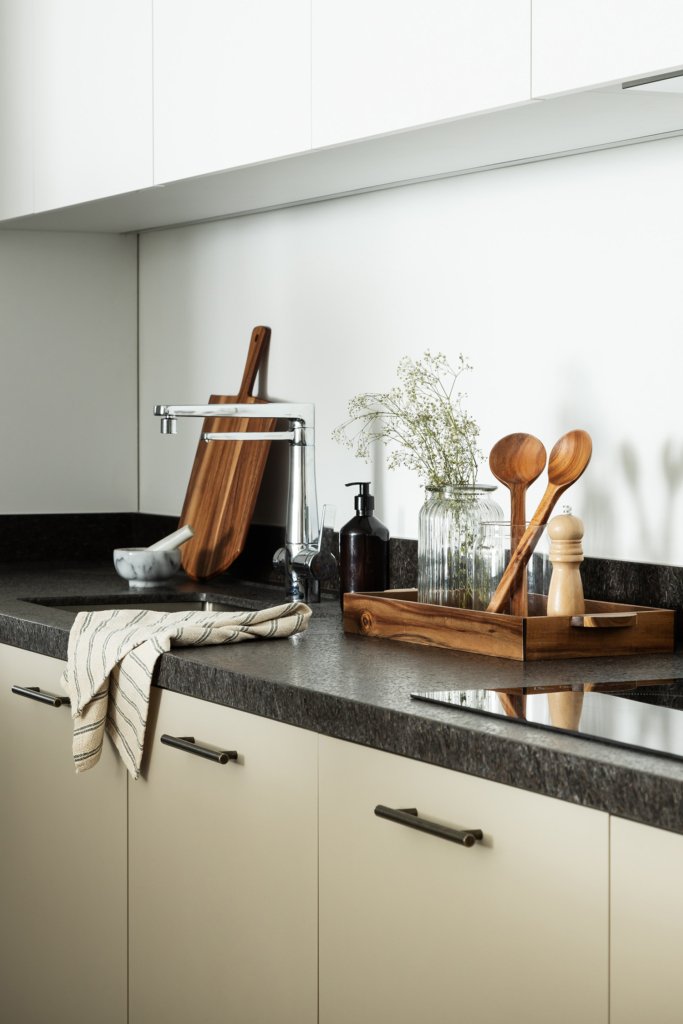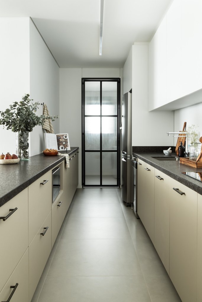 Cozinha e living se conectam de forma leve e natural, garantindo boa circulação e integração entre os espaços. Linhas limpas, tons sóbrios e uma paleta de materiais atemporal constroem harmonia e continuidade visual.