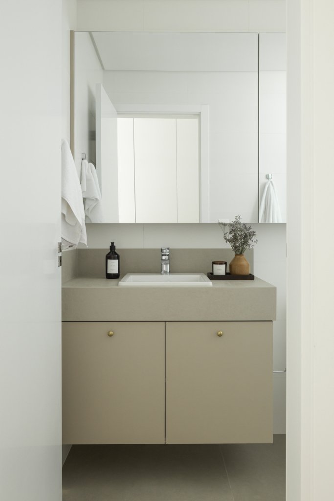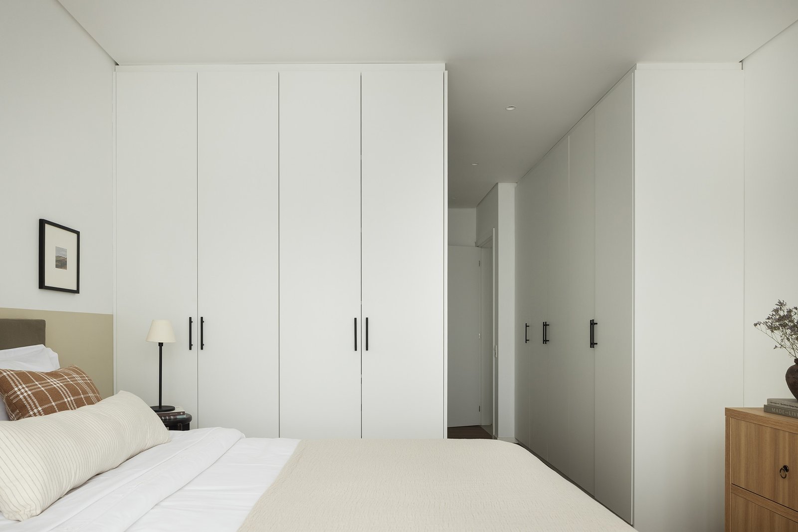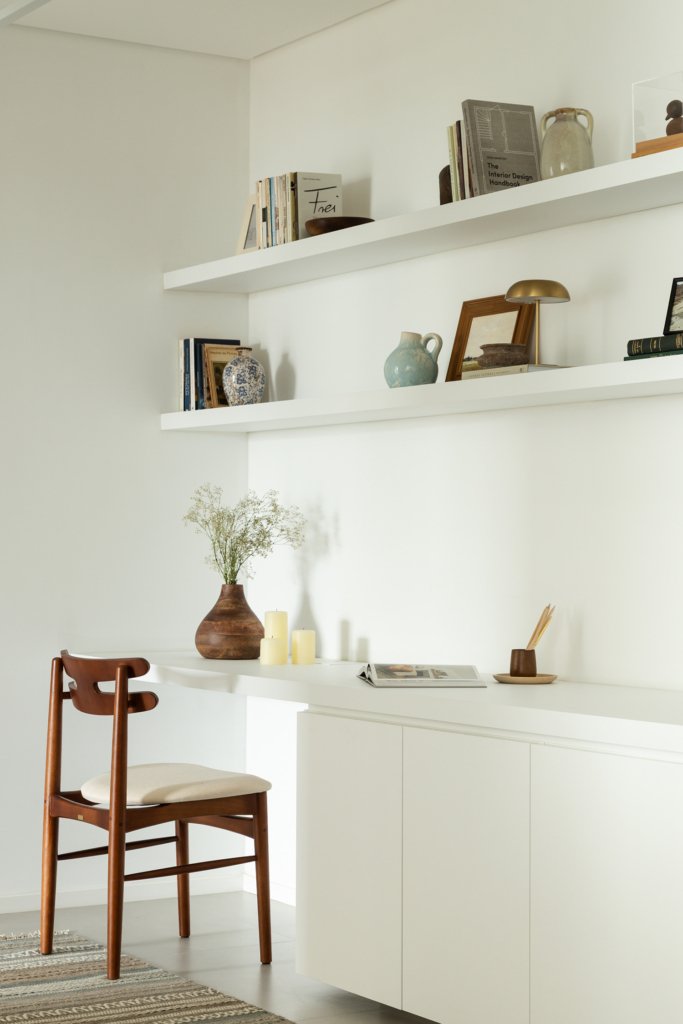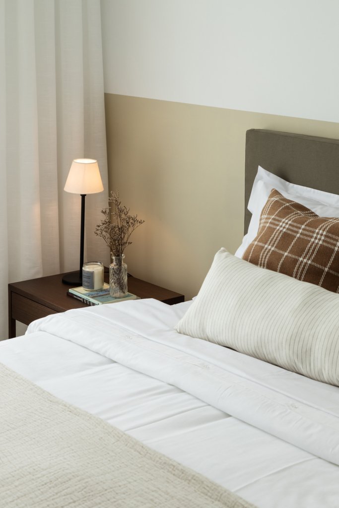 Na suíte, a base clara e o uso pontual da madeira criam uma atmosfera serena e acolhedora. O mobiliário discreto e funcional valoriza o essencial e reforça a sensação de calma e bem-estar.