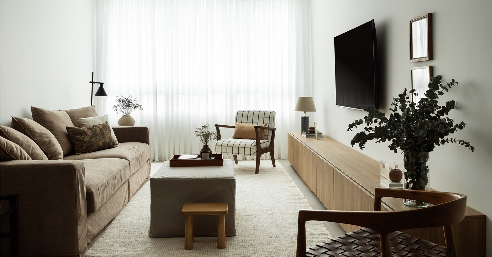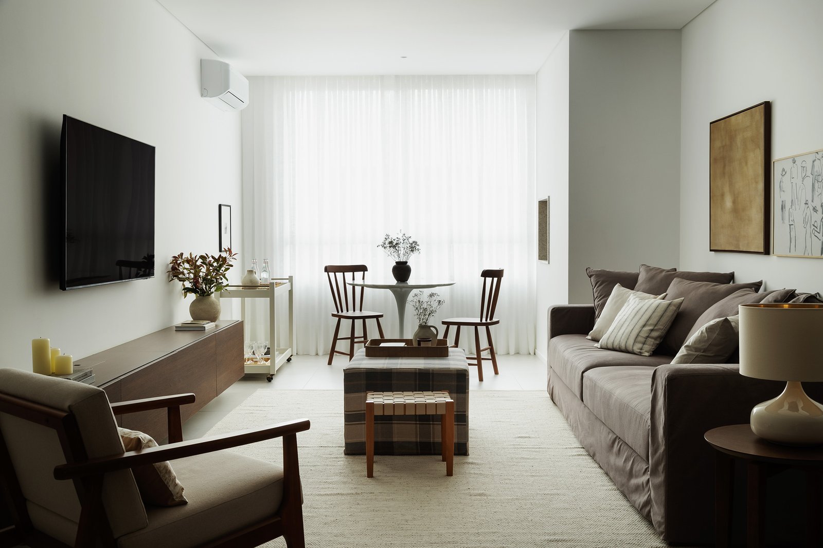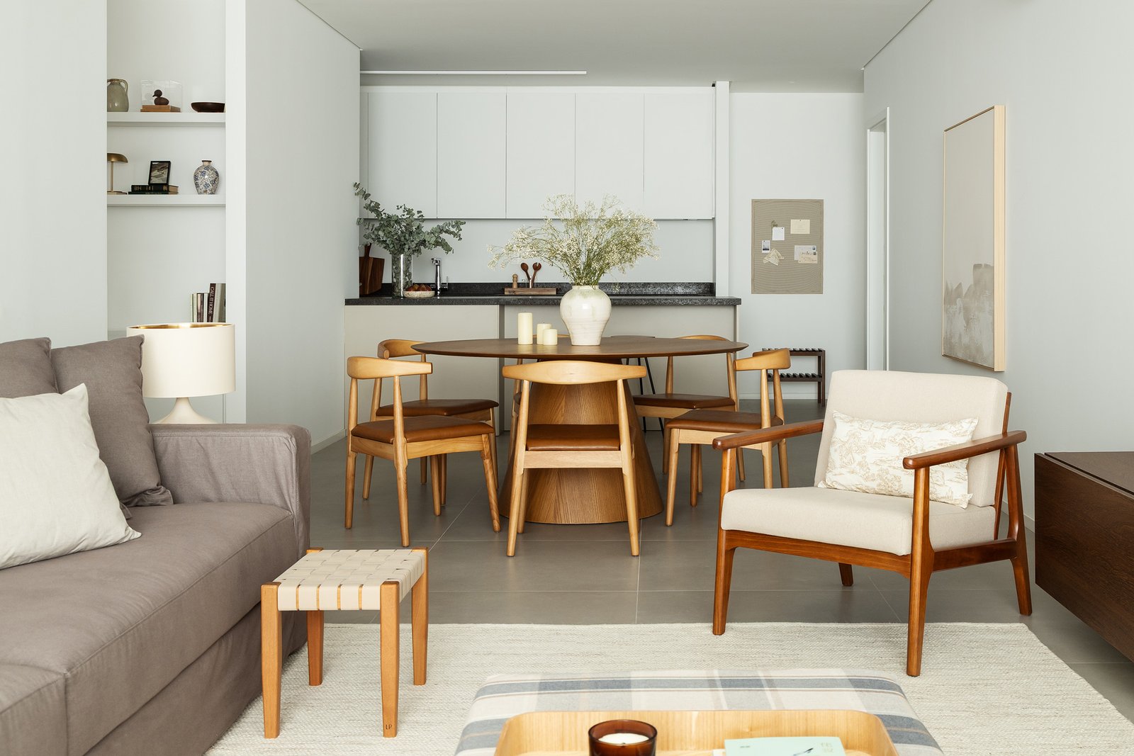 Desenvolvido como apartamento decorado para a Construtora WKoerich, o Edimburgo parte de uma proposta sóbria e funcional, pensada para quem valoriza o aconchego e o ato de receber.